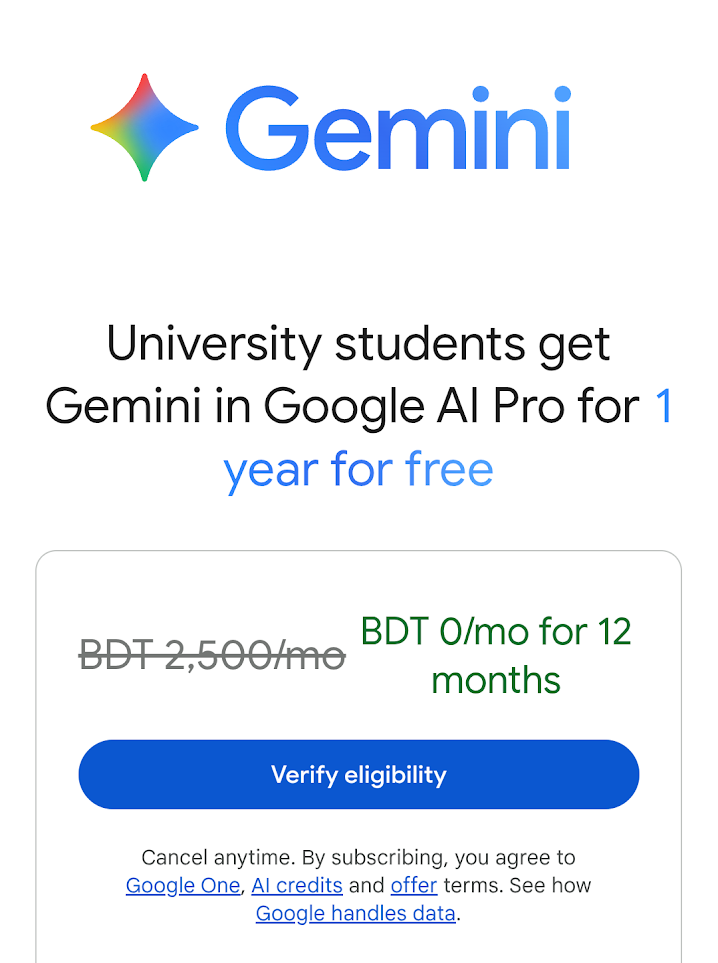 আপনারা হয়তো অনেকেই জানেন বাংলাদেশেও এখন ১ বছরের জন্য ফ্রী গুগল জেমিনি প্রো (Free Google Gemini Pro) এবং ২ টেরাবাইট ফ্রী গুগল ওয়ান স্টোরেজ (2 TB Google One Storage) দেওয়া হচ্ছে। কিন্তু এই অফার টি শুধু ছাত্রদের জন্য। আপনার একটি ভ্যালিড ভার্সিটি থেকে পাওয়া EDU মেইল থাকতে হবে অথবা ছাত্র আইডি কার্ড থাকতে হবে।