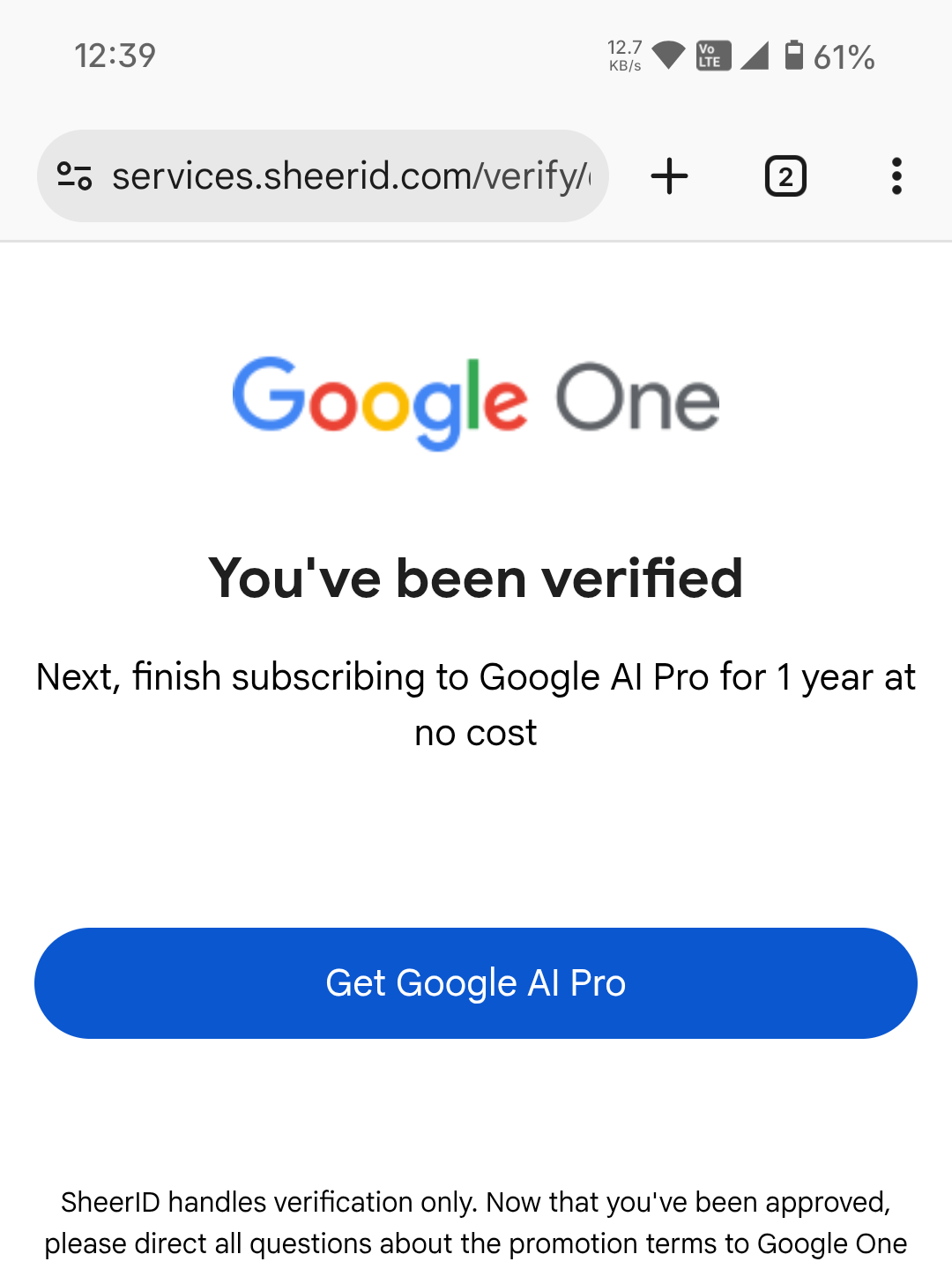 এবার খানিকটা অপেক্ষা করতে হবে। একটু পরে উপরের মতো ম্যাসেজ রিপ্লাই আসবে। ম্যাসেজে দেখতে পাচ্ছেন যে ভেরিফিকেশন সফল হয়েছে। এই ম্যাসেজ টি আসার পরে আপনার ব্রাউজারের Sheerid পেজে ফিরে যান এবং পেজ টি একবার রিলোড করুন। দেখবেন ভেরিফিকেশন বাইপাস হয়ে গেছে এবং আপনাকে Gemini Pro ফ্রী তে একটিভ করতে বলবে।