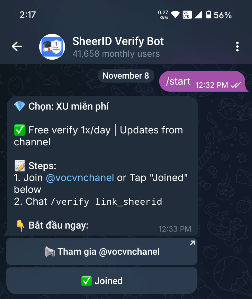 টেলিগ্রামে গিয়ে সার্চ করুন @sheeridverify_bot — অথবা সারাসরি এই লিঙ্কে ক্লিক করলেও টেলিগ্রামে চলে যাবে। বটে প্রবেশ করার পরে একটি চ্যানেল জয়েন করতে বলা হবে। চ্যানেল টি জয়েন করে আবার বটে ফিরে Joined বাটনে ক্লিক করলেই আপনি ফ্রী ক্রেডিট পেয়ে যাবেন, যা দ্বারা Sheerid ভেরিফিকেশন বাইপাস করতে পারবেন।