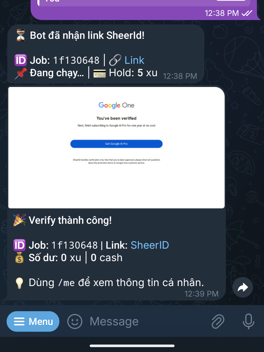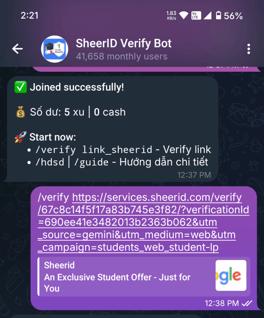 Joined Succesfully! ম্যাসেজ টি চলে আসলে এবার আপনি ব্রাউজারে থাকা Sheerid পেজের Link টি কপি করবেন এবং টেলিগ্রাম বটে ফিরে এসে চ্যাটে লিখবেন /verify এর পরে স্পেস দিয়ে লিঙ্ক টি পেস্ট করে দিয়ে ম্যাসেজ সেন্ড করবেন। দেখুন উপরের স্ক্রীনশটে ঠিক যেভাবে দেখানো হয়েছে।